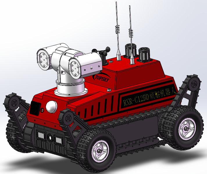 1)     車體★結(jié)構(gòu)型式:采用前后4擺臂+履帶+金屬輪胎的結(jié)構(gòu)形式,最大有效提高前進(jìn)速度、越障性能,同時金屬輪胎可以抗高溫,適合在火區(qū)高溫滅火救援。