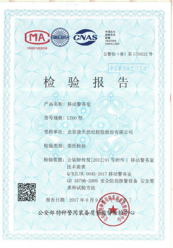 我司的移動警務室取得了公安部特種警用裝備質量監督檢驗中心的檢驗報告。