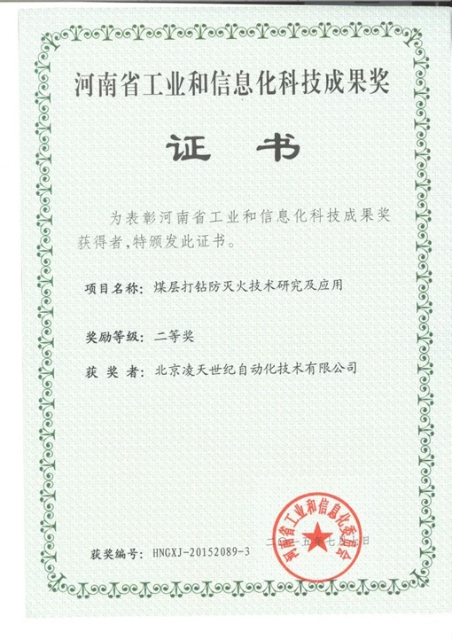 北京凌天煤層打鉆防滅火系統獲河南省工業和信息化二等獎