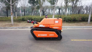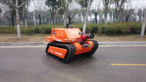 履帶式中型油動力消防滅火機器人,采用柴油發(fā)動機為動力,閉式液壓系統(tǒng)驅動ASV橡膠履帶進行高速行走,搭載了每秒150升的大流量消防炮,攜帶多種檢測、監(jiān)控傳感檢測裝置,對火災場所實施遠程實時監(jiān)控,進行火災撲滅。