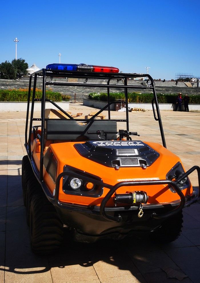 在復雜惡劣的地形條件和自然環境下,水陸兩棲全地形車可以讓搜救隊員和攜帶的救援裝備快速到達救援現場,減少徒步帶來提供消耗,完成最后一公里最好五分鐘緊急救援任務。水陸兩棲全地形車可配備點到絞盤、救援擔架組件、探照燈、警示燈、警報器、脫鉤、破拆工具等裝備, 給救援團隊提供救援保障,更安全的解救傷員和疏散群眾。
