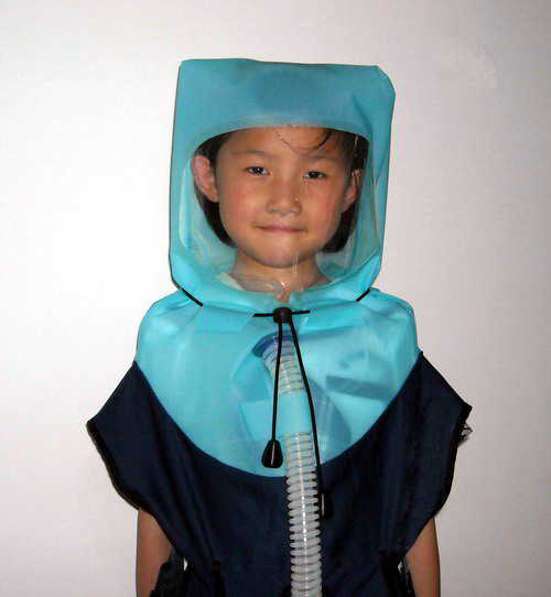 適合兒童(3—8歲)使用,為有效回避戰爭毒氣或有害環境而設計的防毒面罩。利用送風機將外部空氣通過濾毒罐送入頭罩內,形成密閉正壓,使得呼吸方便,活動無不適現象。