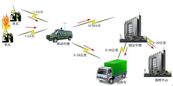 前端人員背負(fù)單兵設(shè)備采集音視頻信號傳給移動(dòng)中繼車,車上的接收合并采集信息后并對接車載(中繼)設(shè)備。由中繼接力發(fā)射 ,從而形成約30公里左右距離的 應(yīng)急通信鏈路,直至指揮中心。